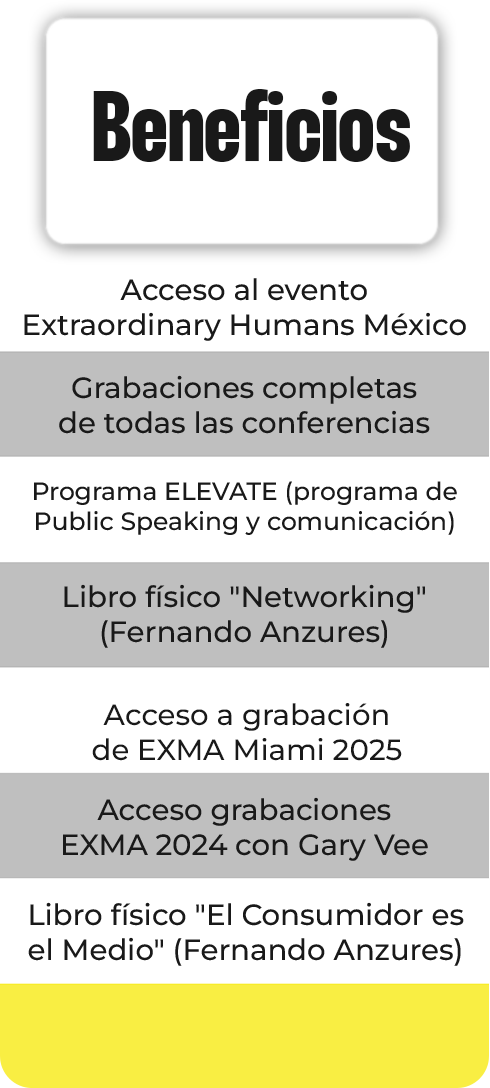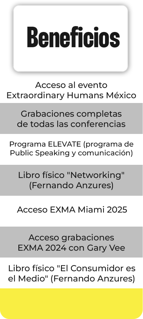 Tu membresía EXMA te da acceso al evento y, según el nivel que elijas, a beneficios exclusivos como networking estratégico y contenido